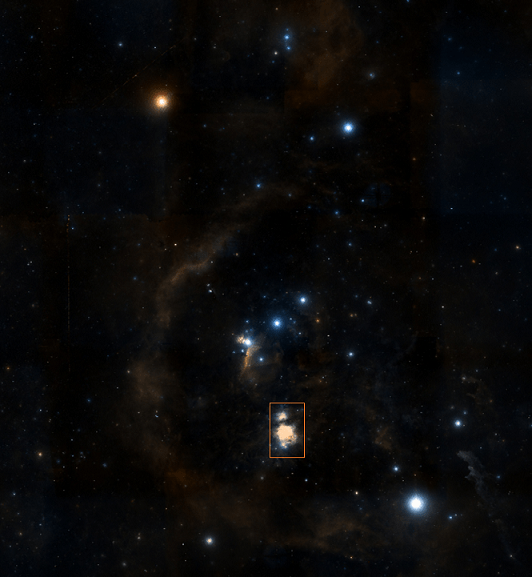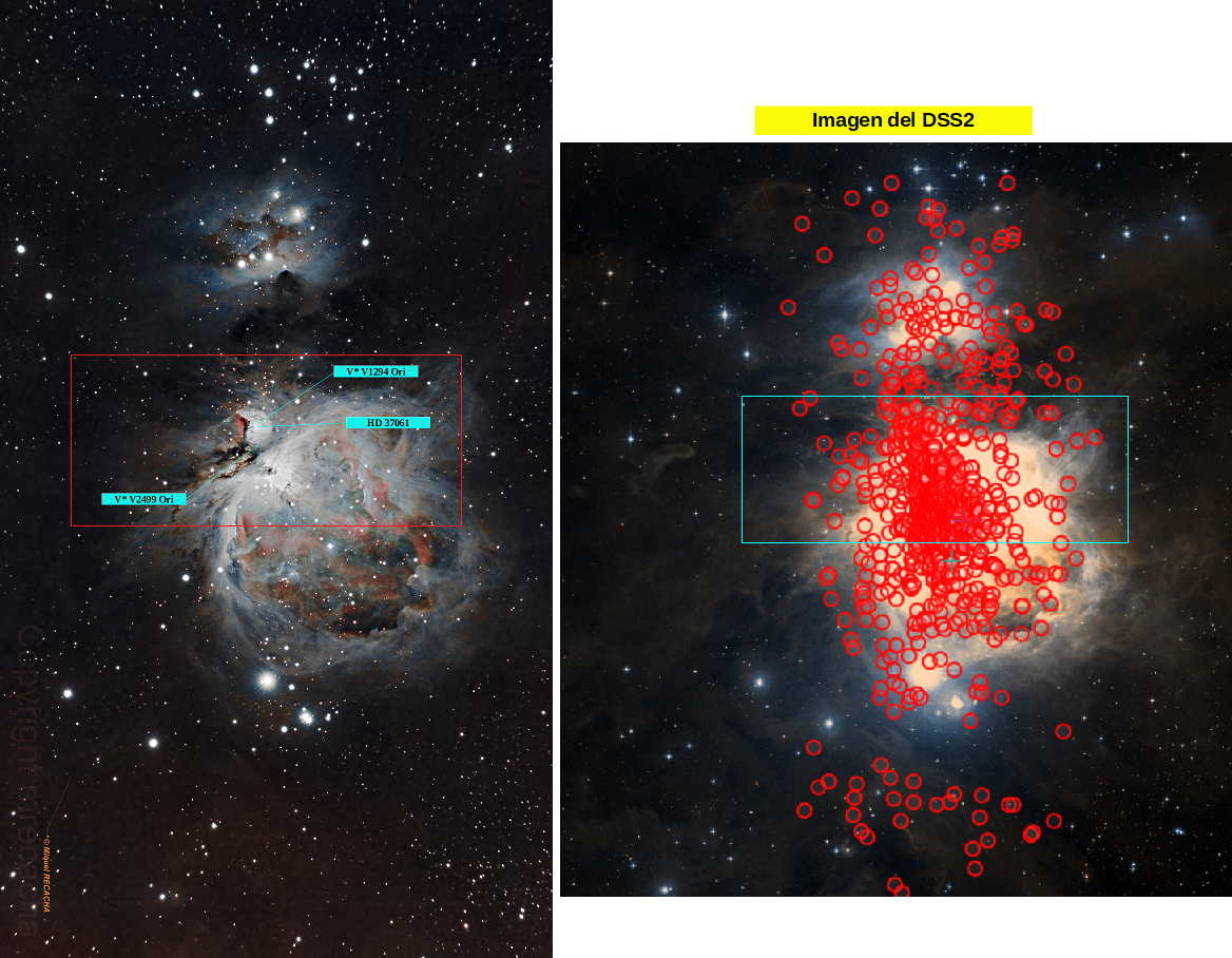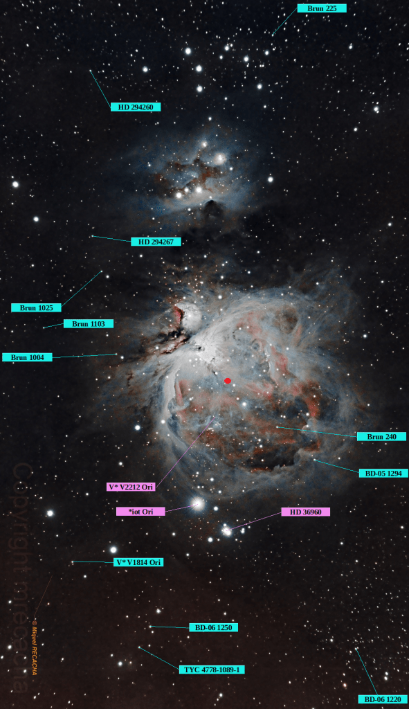Sin el poderío que muestran las dos estrellas anteriores o de otras con más renombre que la rodean, la variable V2212 Ori nos va a permitir tener otra perspectiva de la zona ya que es miembro tanto del cúmulo abierto NAME Orion Nebula Cluster cuyo centro señala el punto rojo de la imagen anterior, como de la nube molecular NAME Ori A.