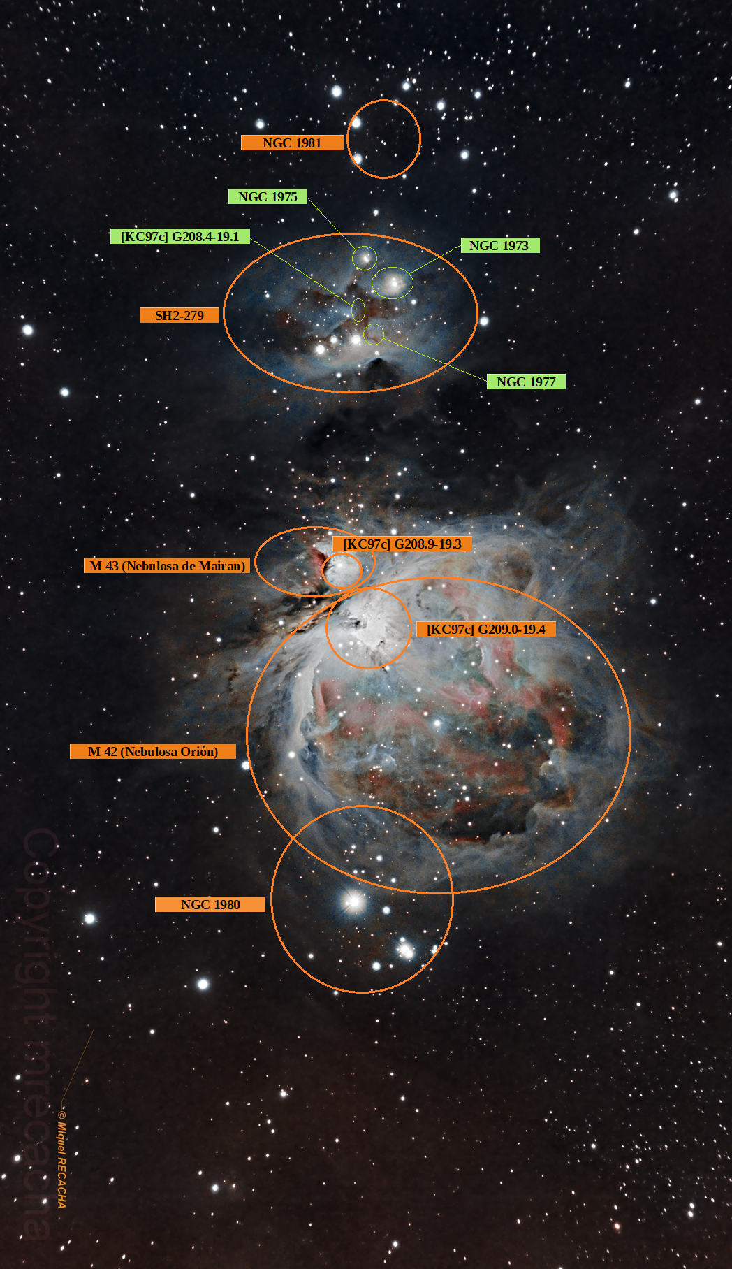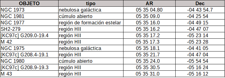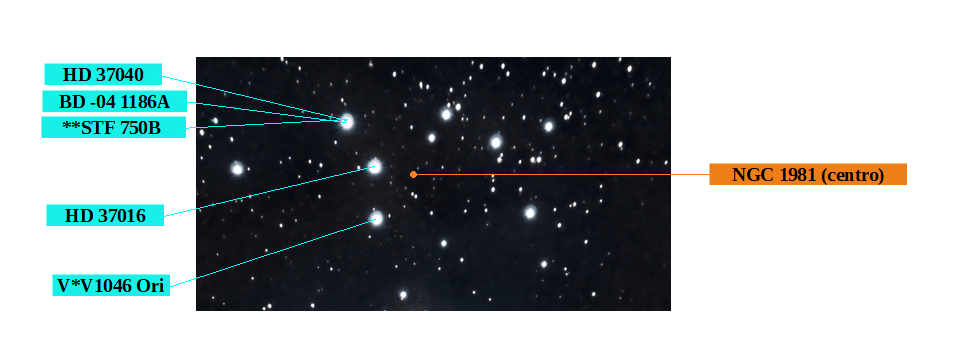 Si empezábamos nuestro recorrido norte-sur con un cúmulo abierto en la parte superior de la foto, vamos a terminar con otro cúmulo abierto en la parte inferior. Ninguno tiene componentes pero ambos delimitan la ‘espada’ del cazador Orión. Si NGC 1981 recibe la denominación de ‘parte superior de la espada’ (Upper Sword), empuñadura también podría servir; NGC 1980 es ‘la parte inferior’ (Lower Sword), punta podría ser. El caso es que, aunque se reconocen estas denominaciones, para comprobarlo yo no me atrevería a recomendar una representación mitológica de la constelación puesto que al magnífico cazador te lo puedes encontrar alzando o no la espada, arrodillado o de pie … en fin, ¡cosas de la mitología!