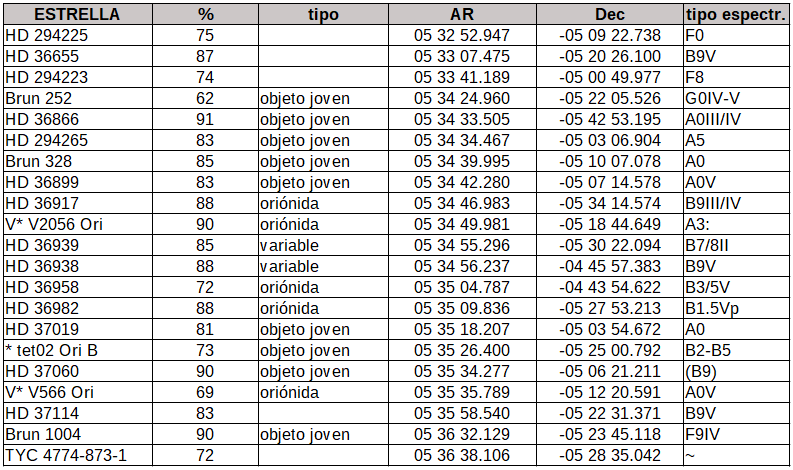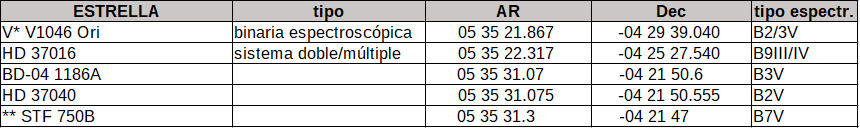 Para terminar esta curiosa selección se ha de citar a HD 37016 que no pertenece al cúmulo pero sí a M 42 con una probabilidad del 75% y es un sistema que, a pesar de estar señalado como múltiple no tiene asignados componentes.